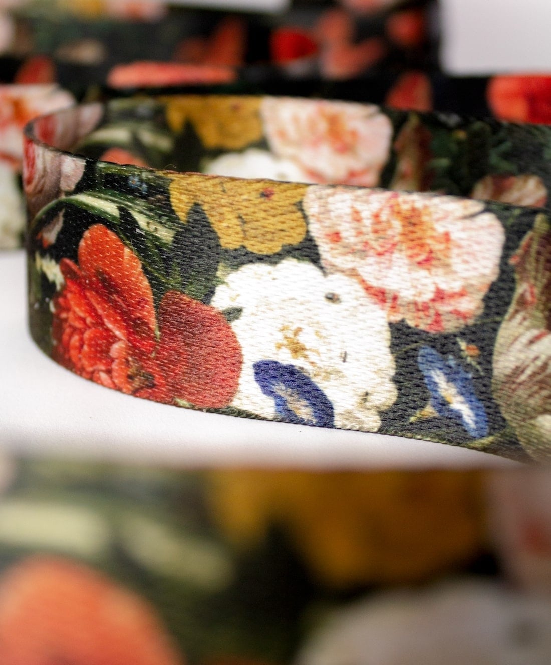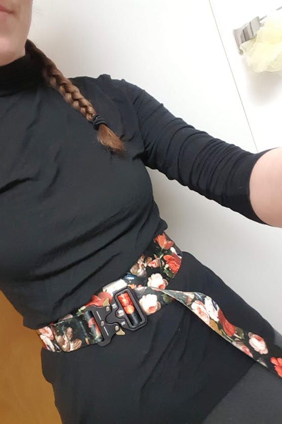 Our floral webbing belt with utility buckle comes in 2 lengths:
