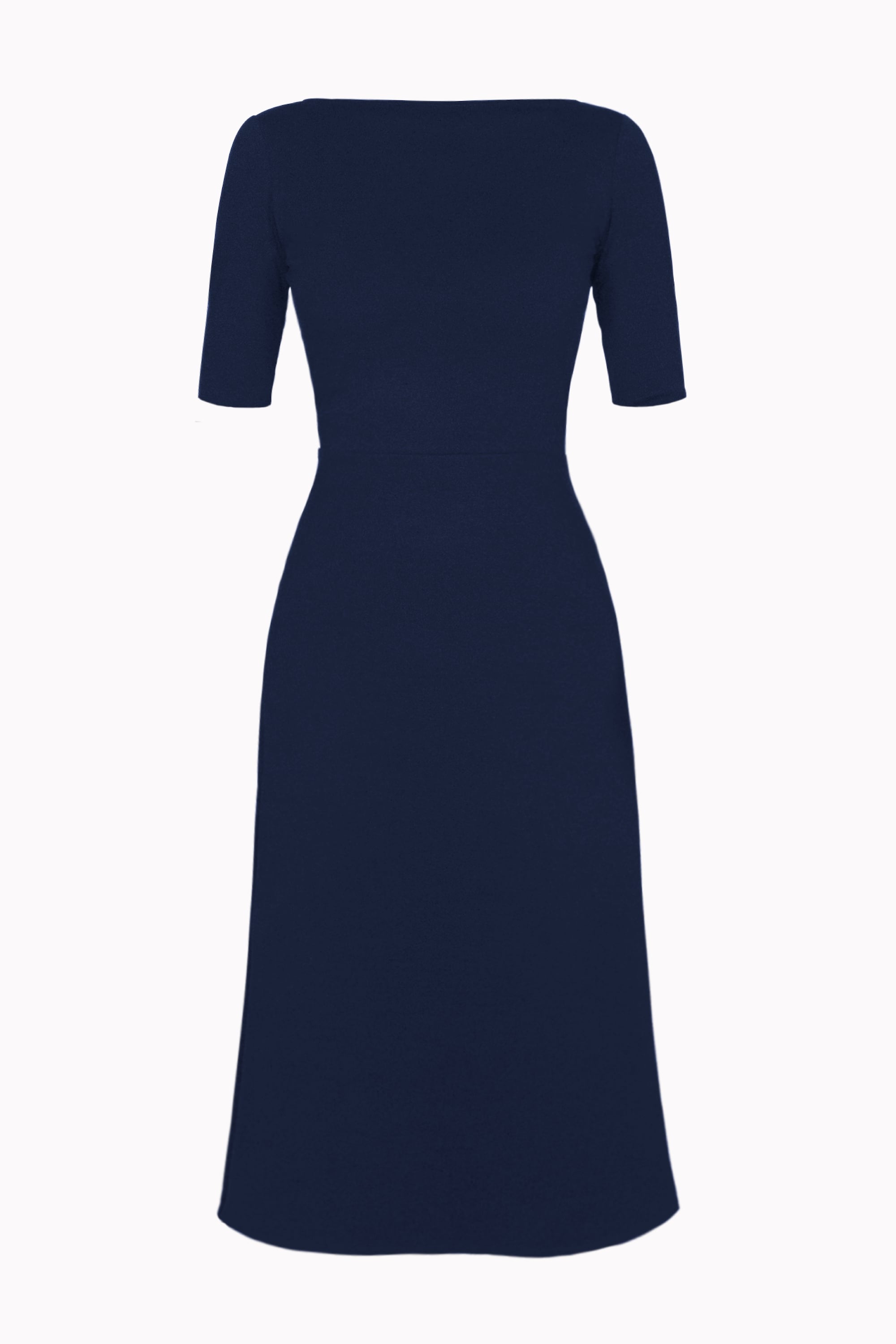 Half Sleeve BCI Cotton Boatneck Mid-calf Flared Dress -- Navy Blue