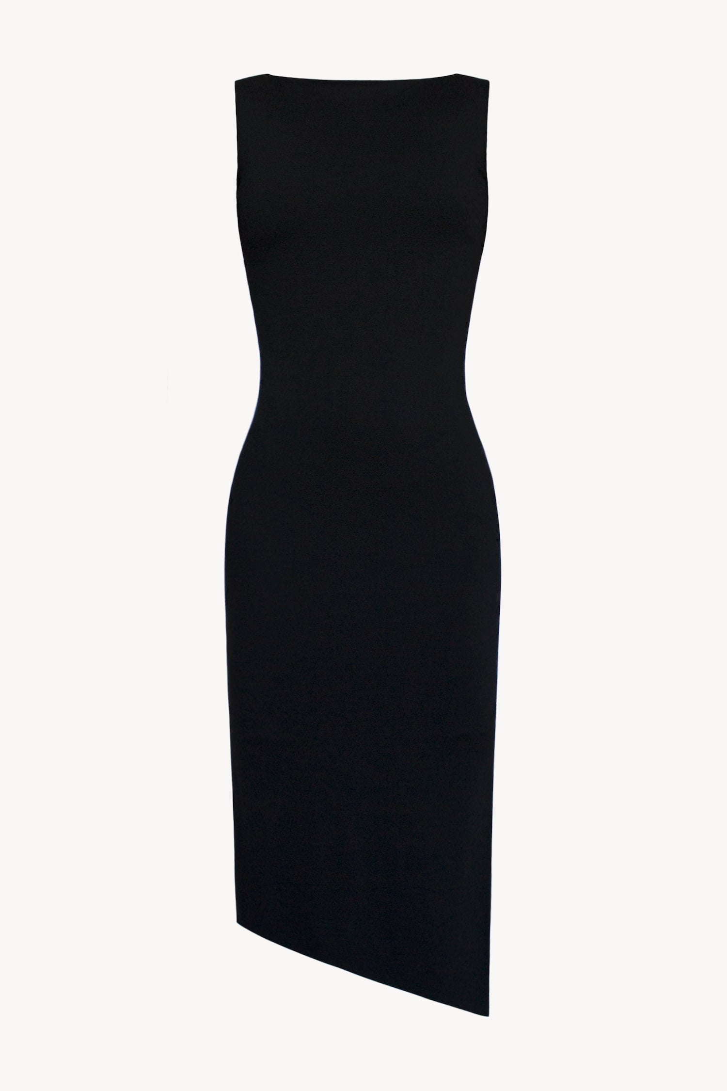 Crafted from 100% extra-fine Merino Wool knit, this bodycon dress features sleek lines with its asymmetric hem and wide boatneck. Lined with power mesh (a lighter version of shapewear mesh) to smooth out lines.